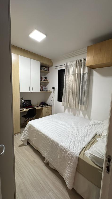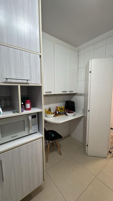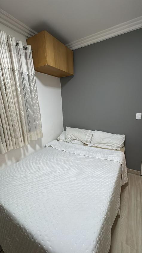 Móveis planejados na cozinha , área de serviço, banheiro, quartos, com uma cama de casal, e estante na sala.